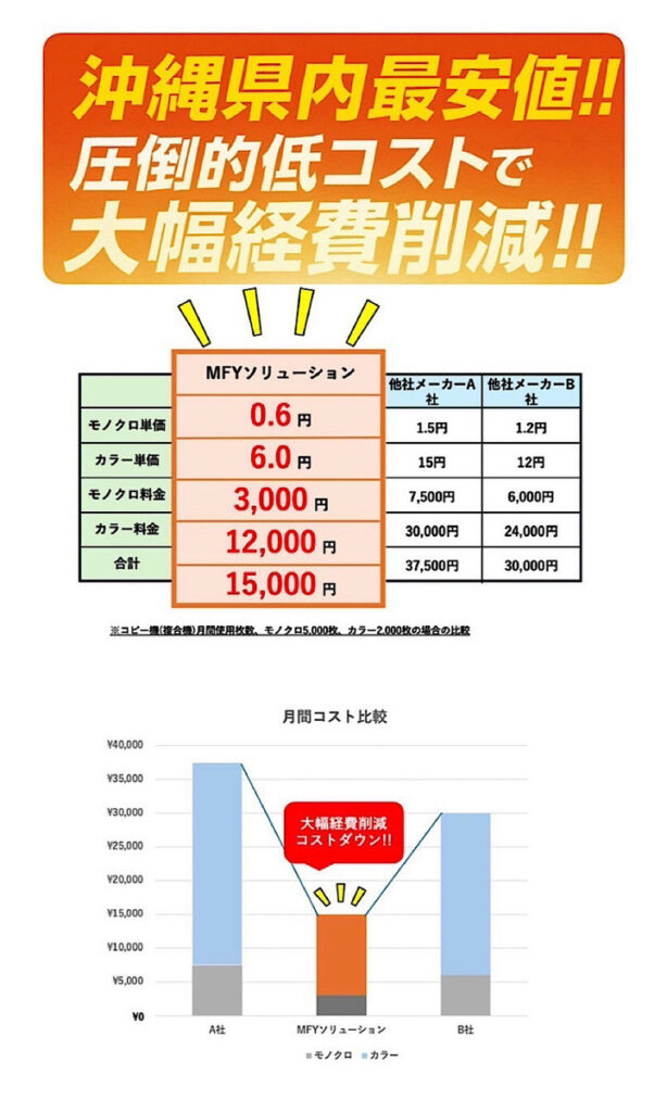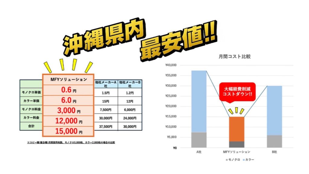 A.初期費用ゼロで導入可能なプランがあります。設置工事費のみ別途となる場合があります。月額は本体代に加え、保守(点検・部品交換・トナー補充・出張対応)を含む構成が一般的です。明細はお見積りでわかりやすく提示します。